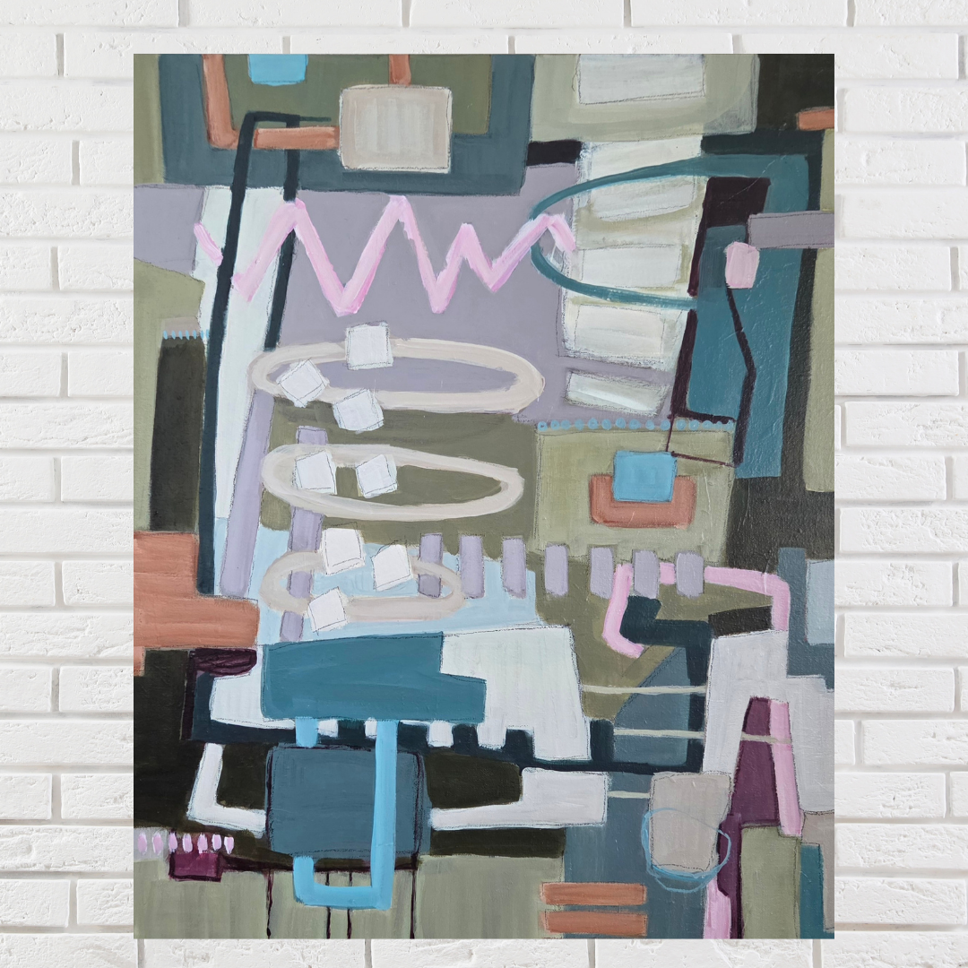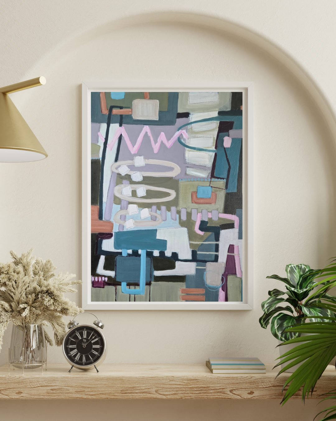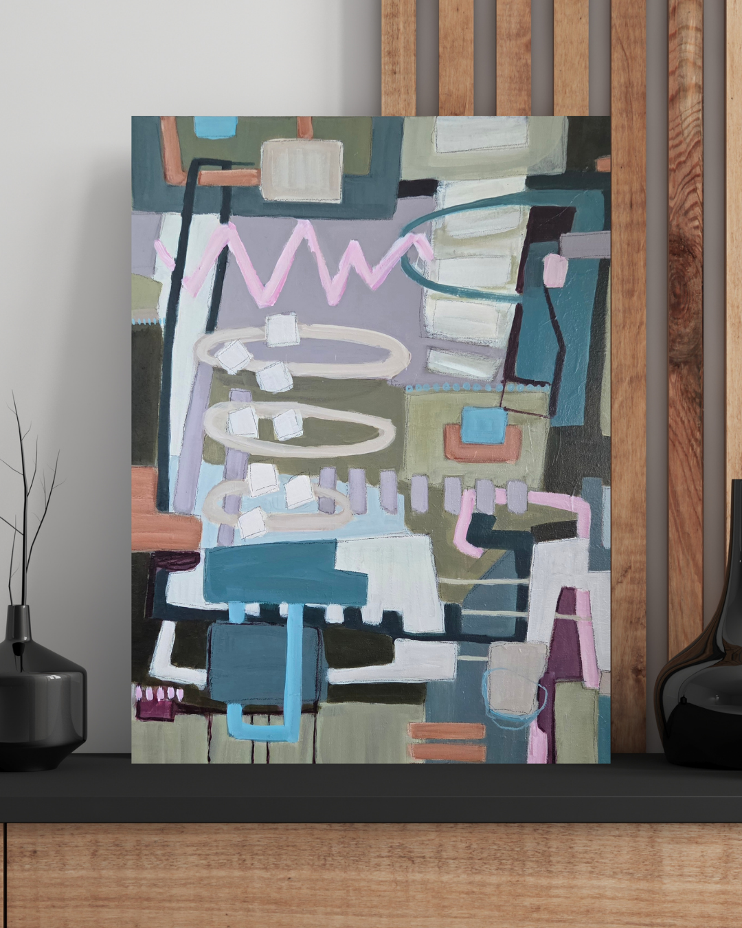 "Something Cold in the Blender" captures that first warm day when winter finally loosens its grip and beach plans start feeling real again. With layered shapes, playful zigzags, and cool-meets-sunny tones, this piece brings an easy, spirited energy to any space.